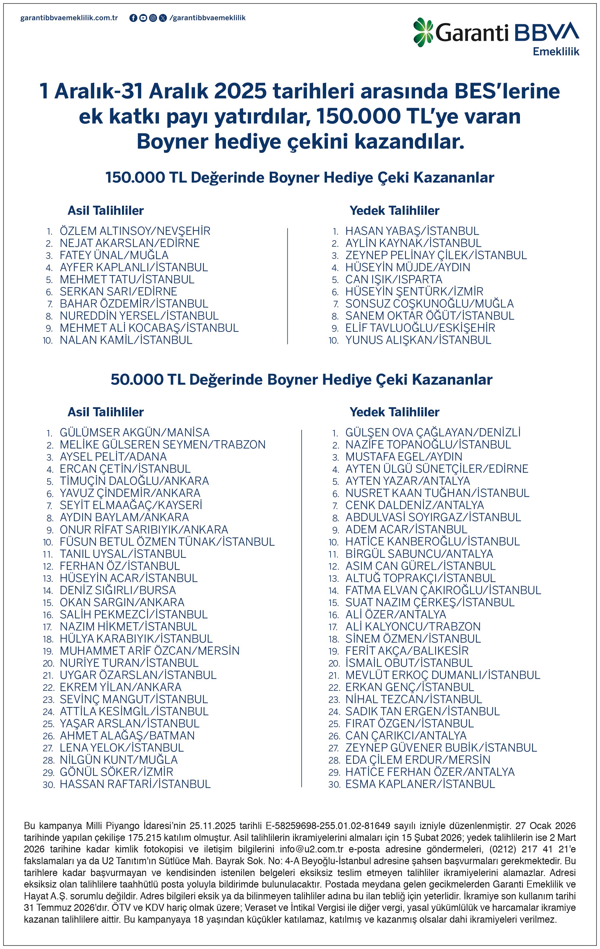 1– 31 Aralık 2025 tarihleri arasında Garanti BBVA veya Garanti BBVA Emeklilik, İnternet Bankacılığı veya Mobil Bankacılık üzerinden veya Garanti BBVA Emeklilik İletişim Merkezi üzerinden sesli onay ile bireysel emeklilik sözleşmesi için 50.000 TL ve üzeri Ek Katkı Payı yatırarak 150.000 TL’ye varan Boyner hediye çekini kazananlar belli oldu! Asil talihliler ve yedek talihliler listesine ulaşmak için buraya tıklayabilirsiniz.